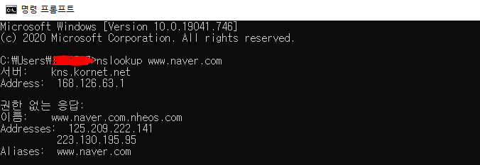 nslookup 으로 ip 조회하기 nslookup은 DNS 서버에 질의하여, 도메인의 정보를 조회 하는 명령어 windows PC의 명령프롬프트나 리눅스의 Shell 에서 사용이 가능하며, 도메인의 정보를 쉽게 조회 할 수 있다 nslookup nslookup 을 입력하면 원하는 도메인의 ip정보가 출력된다 etc 2021.01.22